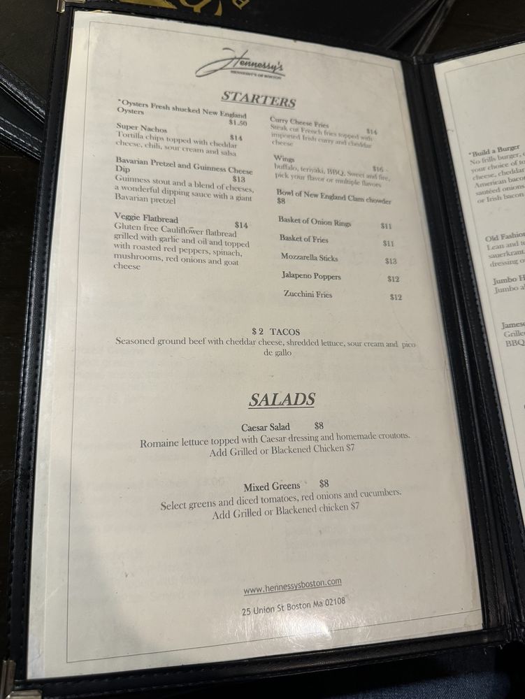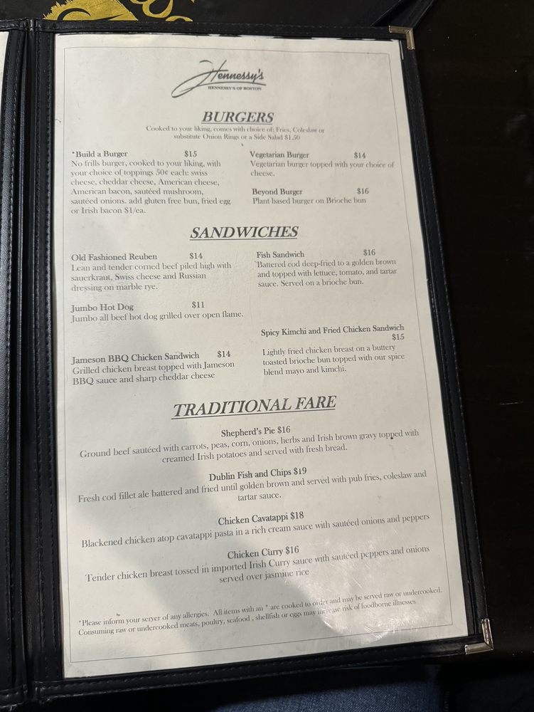Hennessy's is a popular Irish bar and music venue located in Boston, MA. This vibrant establishment offers a variety of amenities such as outdoor seating, live music, and a full bar. Known for its lively atmosphere and good vibes, Hennessy's is a must-visit spot for those looking for a fun night out. The menu features delicious Irish-inspired appetizers like Irish Nachos and Jameson BBQ Wings, as well as hearty sandwiches such as the Fried Fish Sandy and Reuben Sandwich. Customers rave about the friendly staff, great selection of beer and spirits, and tasty Happy Hour specials. Whether you're craving traditional Irish fare or looking to enjoy live music with friends, Hennessy's has something for everyone. Don't miss out on the fun at this lively Boston hotspot!